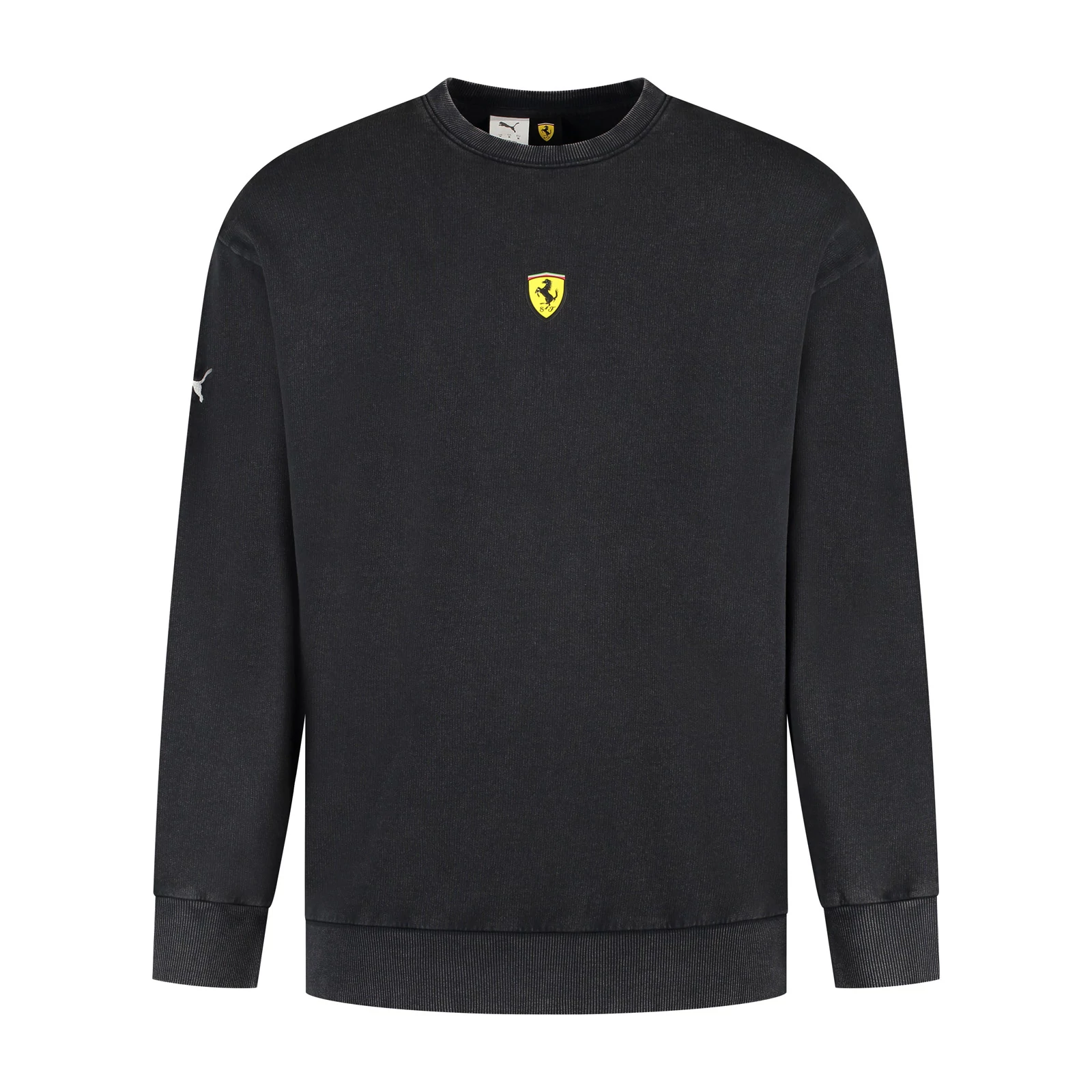 Klasszikus fazonú bebújós pulóver a Ferrari rajongóknak. Elején egy varrott Ferrari emblémával. Hátán egy mutatós Forma 1 autós motívumot láthatunk a legendás Ferrari emblémában. A pulóver különlegességét anyagának megjelenése adja, ez a koptatott anyag ad igazán egyedi és különleges megjelenést ennek a remek pulcsinak. Anyaga: 100% pamut.