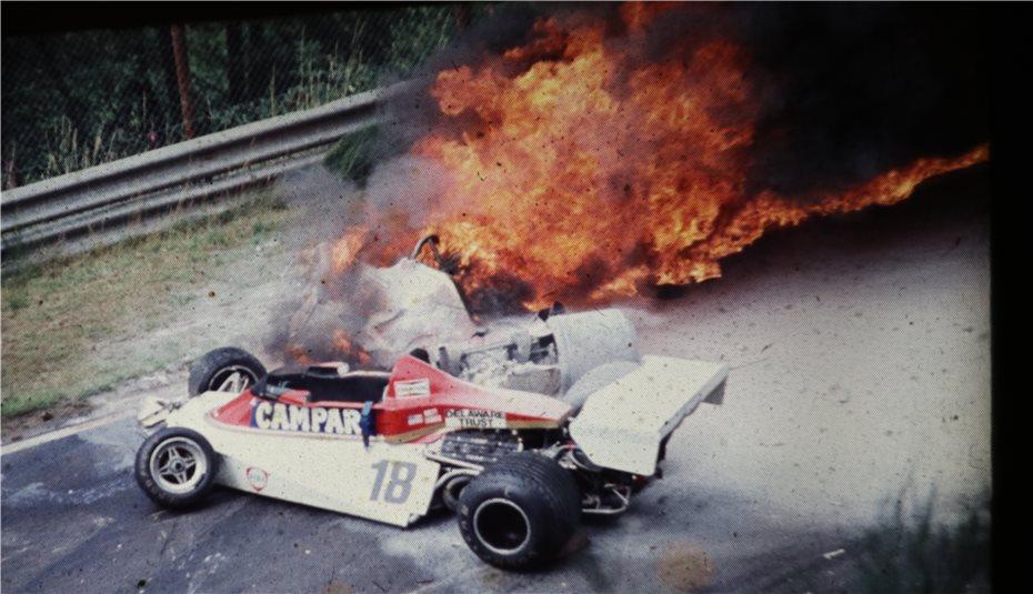 Azt, hogy mi történt közben, a világ is csak egy 14 éves amatőrfilmes fiú felvételéből ismerhette meg, aki teljesen véletlenül a Bergwerk kanyar fölötti domboldalban ült és elindította felvevőjét. Látható, amint a Ferrari úgy 200 kilométer per órás tempóban felhajt a kerékvetőre, megcsúszik, és a balkanyarból kivágódik jobbra. A pálya azon részén szikla volt, onnan Lauda gépe már lángba borulva repül vissza az aszfalt közepére. A következő versenyző, az amerikai Brett Lunger nem tudja kikerülni a roncsot, belerohan, és métereken keresztül tolja maga előtt. Aztán ő és a következő érkezők, akik már önként álltak meg segíteni, megpróbálkoznak a lehetetlennel: kihúzni a világbajnokot a 800 fokos pokolból. Harald Ertl, Guy Edwards és főképp Arturo Merzario hihetetlen bátorsággal tették a dolgukat, míg az egyetlen közelben álló pályabiztonsági ember – civil ruhában!– jóformán csak szemlélője volt az eseményeknek. Edwards visszaemlékezése szerint az egészben a legborzasztóbb az volt, hogy Lauda végig magánál volt, a lángok közül kihallották ordítását és könyörgését, ahogy rimánkodott, mentsék ki valamiképpen.