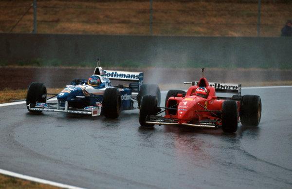 Ezt használta ki Michael Schumacher, aki könnyű autóval, és teljes esős beállítással vágott neki a futamnak – azonban a német beragadt a rajtnál, a Ferrari kis híján lefulladt, és hat pozíciót el is bukott, mire lendületbe tudott jönni. A bajnoki címért küzdő, és az élről rajtoló Damon Hill szintén pocsék rajtot vett, de hátrébb is több pilóta balesetet szenvedett a futam elején, az első két kör után mindössze 14 autó maradt versenyben! Hamarosan a rendkívül enervált Hill is követte őket, megpördült a célegyenesben, és a boxutca falának csapta a Williamst, és azonnal kiesett. A grove-i csapat Villeneuve-ben bízhatott ezt követően, azonban ő sem tudta megállítani a félelmetes tempóban versenyző Schumachert, aki az irreális körülmények közt más kategóriában vezetett a többiekhez képest, és a 13. körben átvette a vezetést, és eltűnt a távolban, körönként átlagosan 3 másodpercet (!) vert mindenkire.
